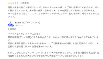 平尾のパーソナルジムブースフィットへの口コミ体の状態を解析してメニューの引き出しが豊富知識が豊富で、こちらの疑問点も解決してくれるため、安心してトレーニングできます。マッサー...